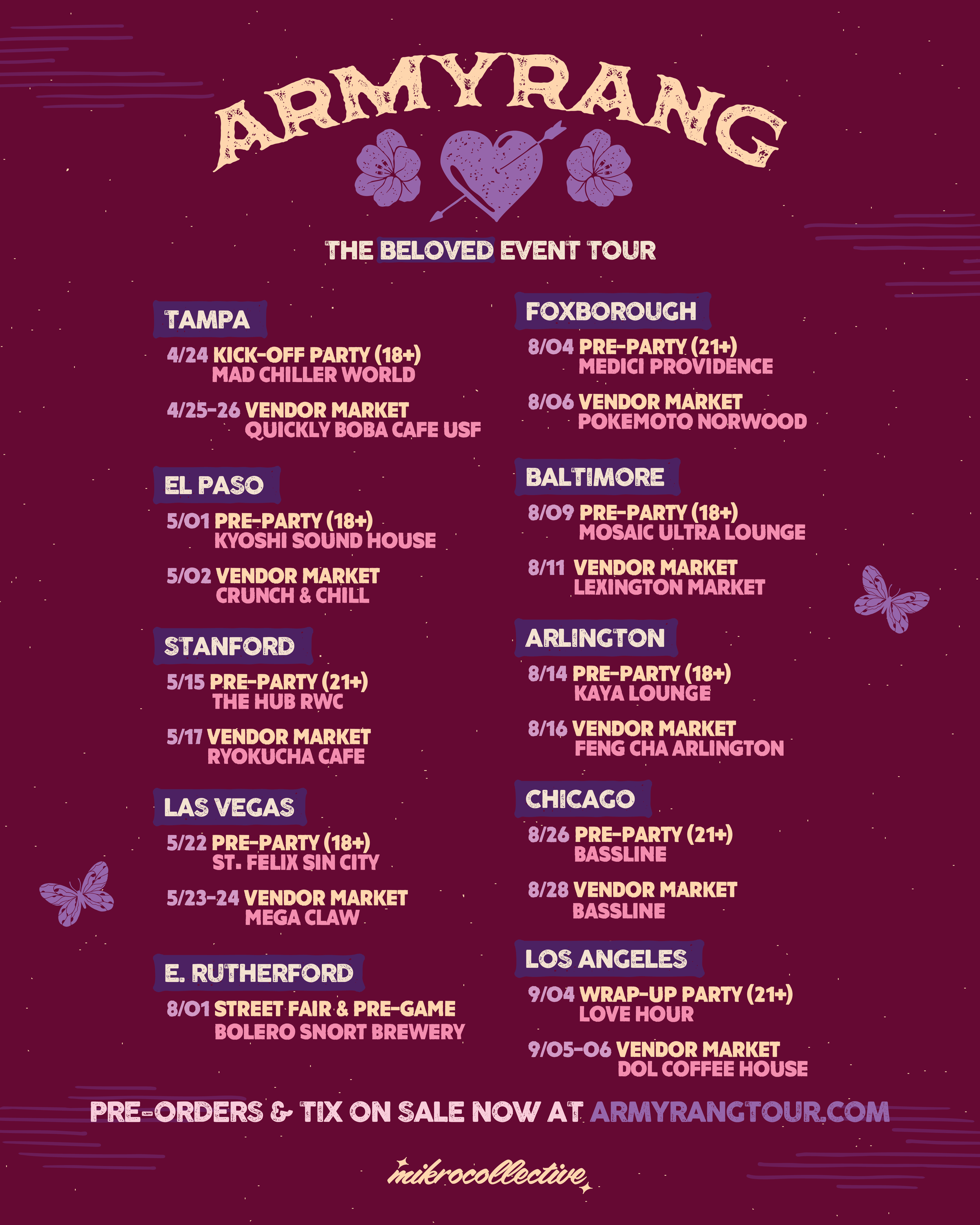 Find ARMYRANG: THE BELOVED EVENT TOUR in Tampa, El Paso, Stanford, Las Vegas, East Rutherford, Baltimore, Foxborough, Arlington, Chicago and Los Angeles for social Vendor Markets, ARMY Dance Parties and more! We can’t wait to meet ARMY and make new friends along the way!